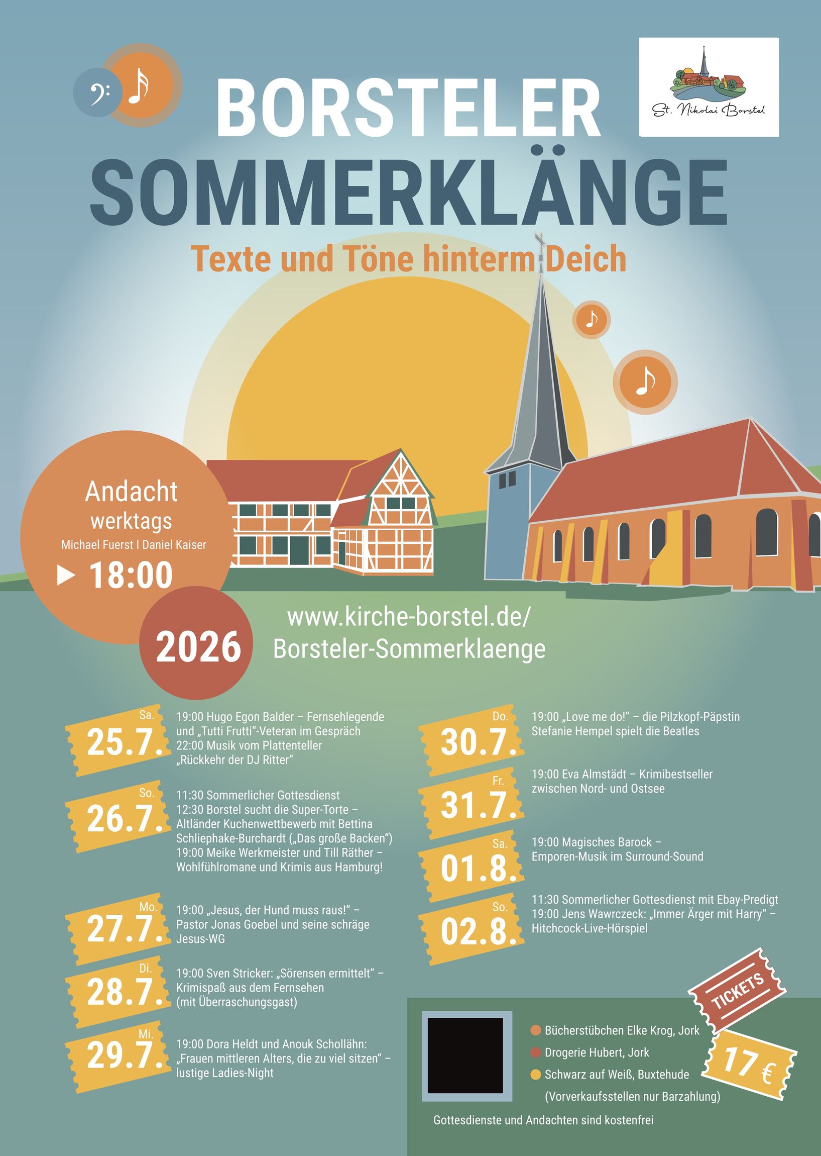 Ab sofort sind die Karten an den Vorverkaufsstellen und im Internet zu erhalten. www.kirche-borstel.de/Borsteler-Sommerklaenge, Vorverkauf: Bücherstübchen Elke Krog und Drogerie Hubert, Jork; Buchhandlung Schwarz auf Weiß, Buxtehude.