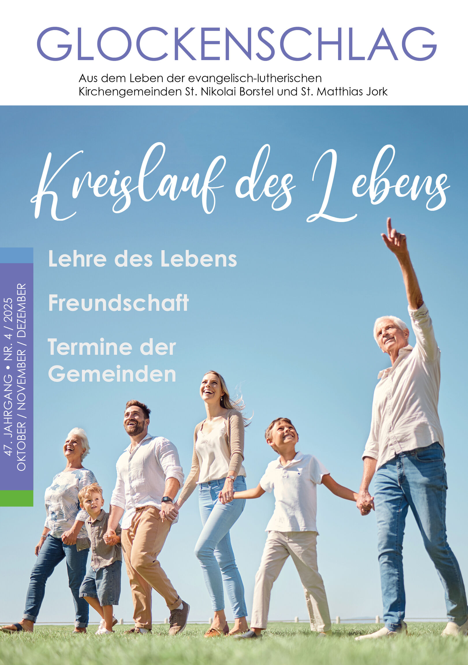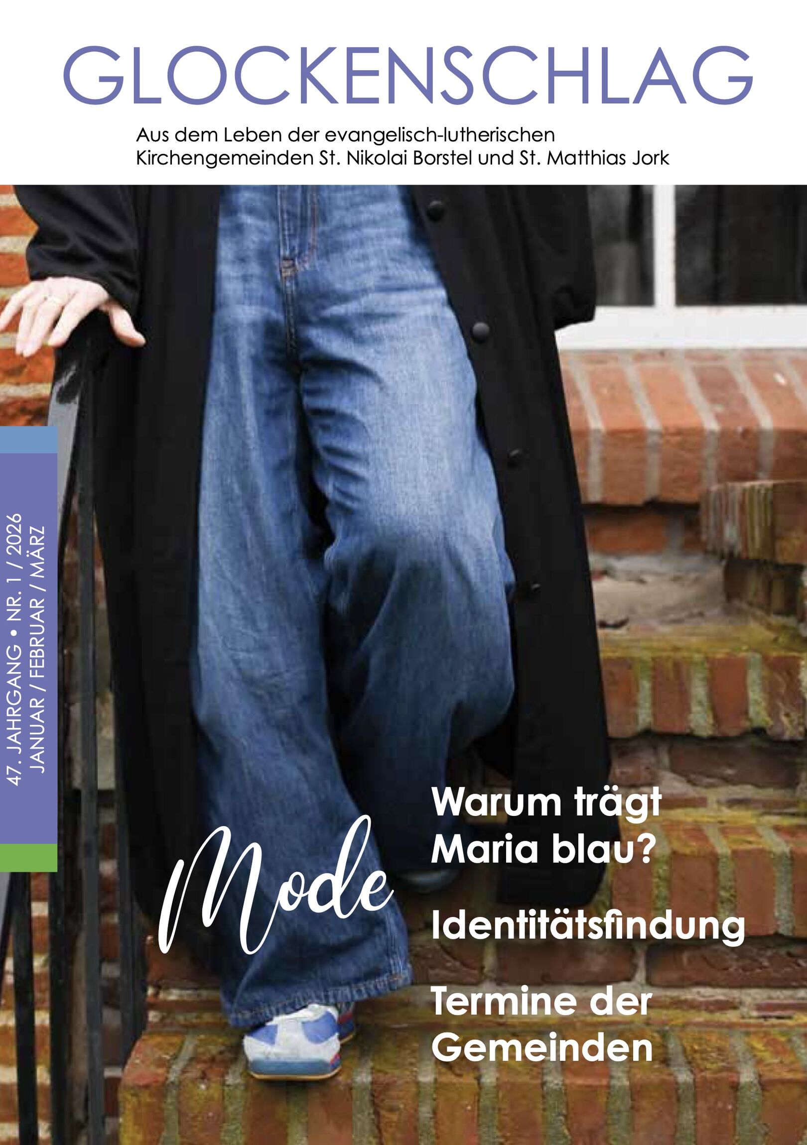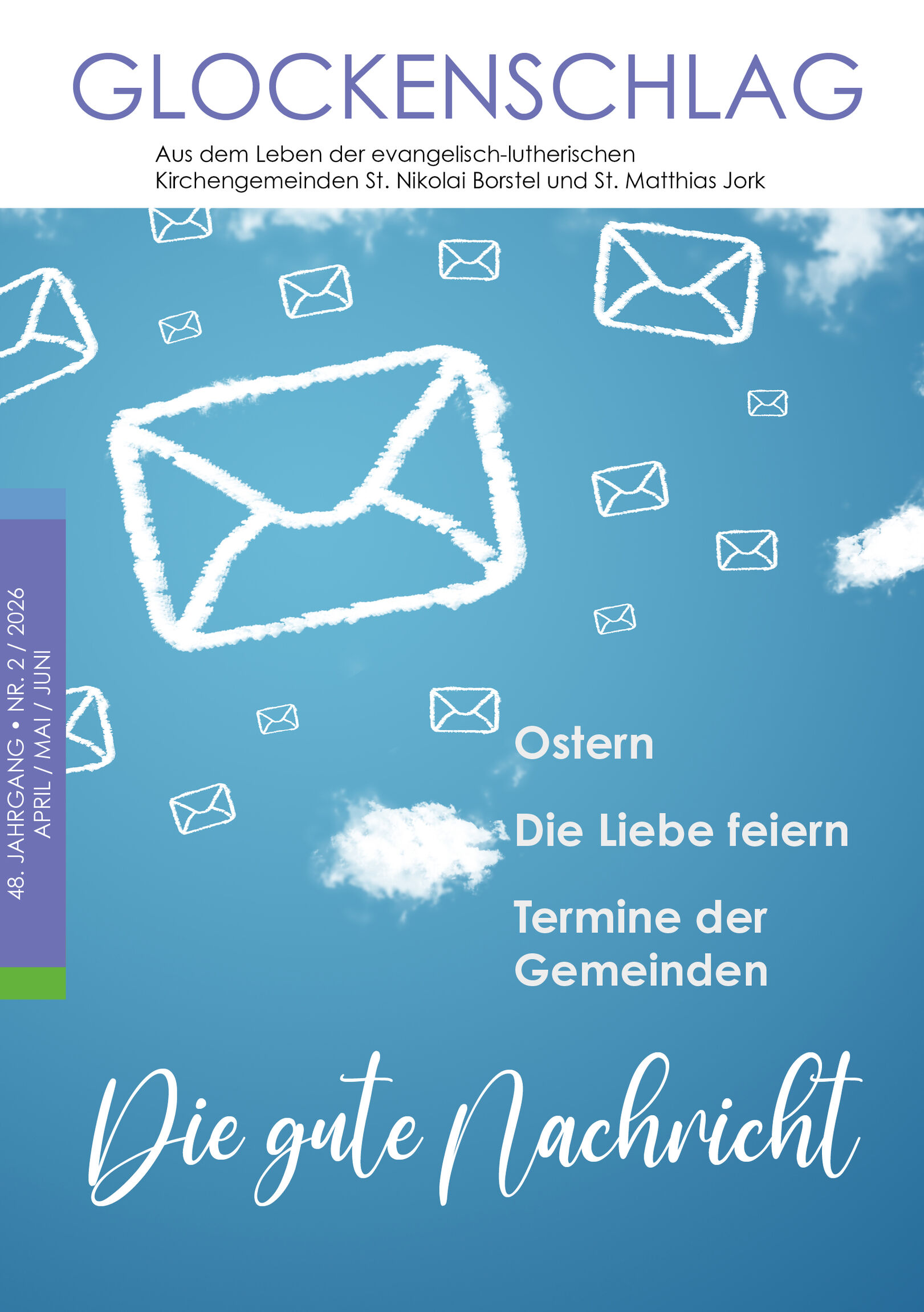 Vierteljährig erscheint unser Gemeindebrief „Glockenschlag“. Zusammen mit der Jorker Kirchengemeinde möchten wir Sie über Ereignisse und Termine unserer Gemeinden informieren. Darüber hinaus enthält der Glockenschlag immer auch ein Schwerpunktthema. Die Konfirmanden der Borsteler Kirchengemeinde verteilen unseren Gemeindebrief an alle Haushalte.